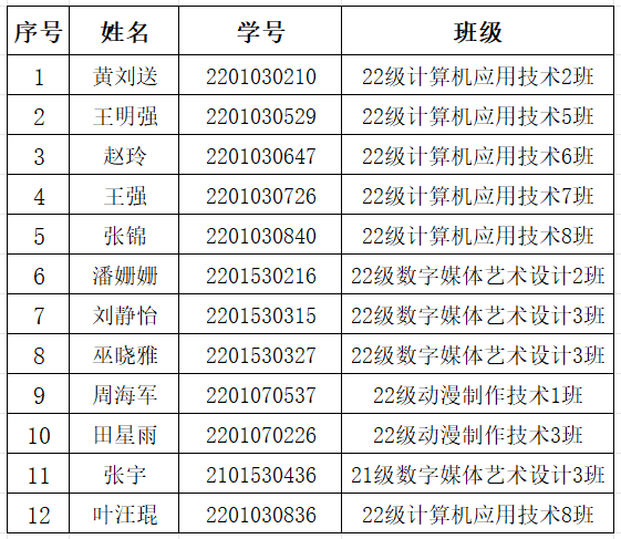 根据《德赢Vwin官方区域合作伙伴学生学籍管理实施细则》第四十六条,经信息技术学院会议研究,决定给予黄刘送等12名同学(名单见附件)退学处理。现予以公示,公示时间:2023年10月10日至10月16日。公示期内,若有异议,请以书面形式向信息技术学院学生管理科反映。
